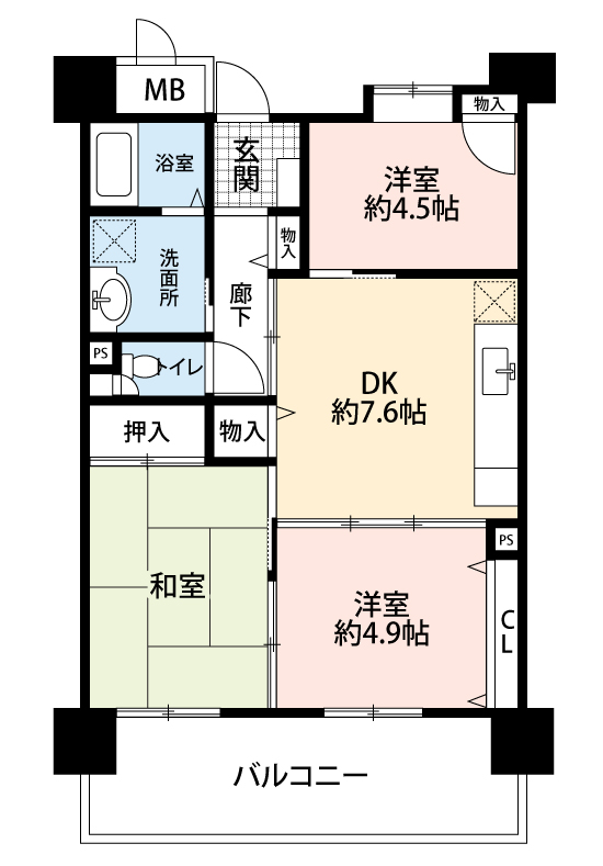 部屋も広く、収納や設備も充実しています。日当り良好でベランダが広く、洗濯物も良く乾くので助かります。 周辺には、スーパーやコンビニ・ドラッグストアがあり便利です。